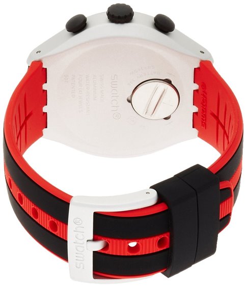 Marchio SWATCH dal 1983 leader mondiale della categoria. Orologio della linea Irony Xlite, con cassa in alluminio con inserti e pulsanti in plastica nera, cinturino in silicone a righe verticali nere e rosse, funzione di cronografo e datario a ore 6.
