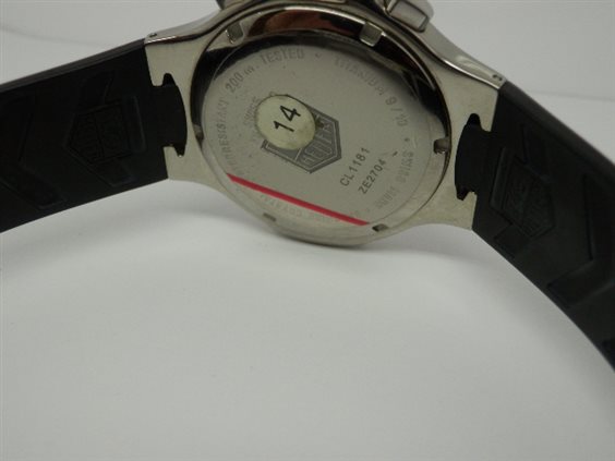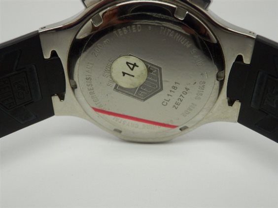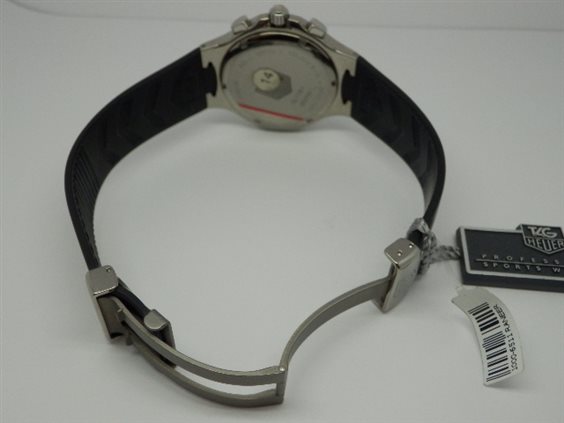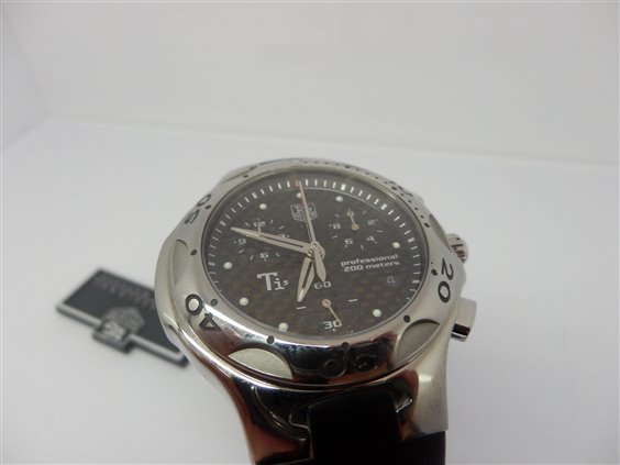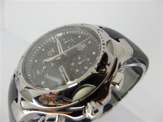 Orologio cronografo al quarzo Ti5, quadrante nero, datario ad ore 4. Funzioni cronometraggio semplice ed addizionale, misurazione dei tempi intermedi e di due tempi ravvicinati, visualizzazione al 1/10 di secondo, contatori dei secondi e delle 12 ore su piccoli quadranti decentrati. Cassa in lega di titanio, finitura lucida. Quadrante in fibra di carbonio, indici luminosi, lancette nichelate dalla forma a lama, vetro zaffiro inscalfibile bombato. Ghiera girevole unidirezionale, in lega di titanio lucido con scanalature ed indicazioni per le immersioni. Corona e fondello serrati a vite assicurano un'impermeabilità fino a 200 metri. Cinturino in caucciù vulcanizzato perfettamente integrato nella cassa, garantisce una resistenza eccezionale, chiusura pieghevole in titanio grado 5. Curiosità: Il titanio grado 5 (Ti5) è una lega di titanio (90%), alluminio (6%) e vanadio (4%). Il titanio grado 5 è due volte più leggero e resistente dell'acciaio, non contiene nickel e quindi è antiallergico. Tag Heuer è la prima azienda orologiera ad aver lucidato completamente un orologio composto da questa lega di titanio.