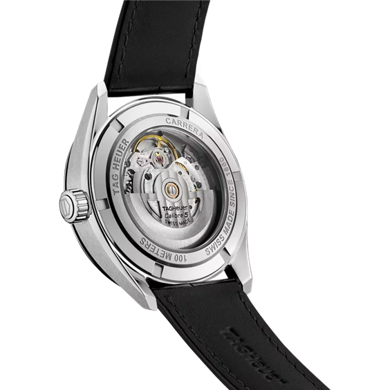 Grazie all'iconico design, il TAG Heuer Carrera combina la precisione nella misurazione del tempo con un look distintivo. Lo splendido quadrante argentato spazzolato effetto "soleil" è completato da lancette e indici rodiati e da uno scudo TAG Heuer applicato. Lancette e indici rivestiti di Super-Luminova® abbinati a vetro zaffiro bombato con trattamento antiriflesso su entrambi i lati: un connubio perfetto per resistenza e precisione. L'elegante e robusta cassa in acciaio da 39 mm ospita il movimento automatico di manifattura ad alte prestazioni Calibre 5, visibile attraverso il fondello in zaffiro. Il cinturino in alligatore nero con fibbia pieghevole in acciaio dotata di logo TAG Heuer applicato e doppi pulsanti di sicurezza offre un sorprendente contrasto con il quadrante.