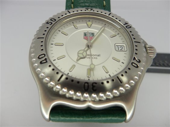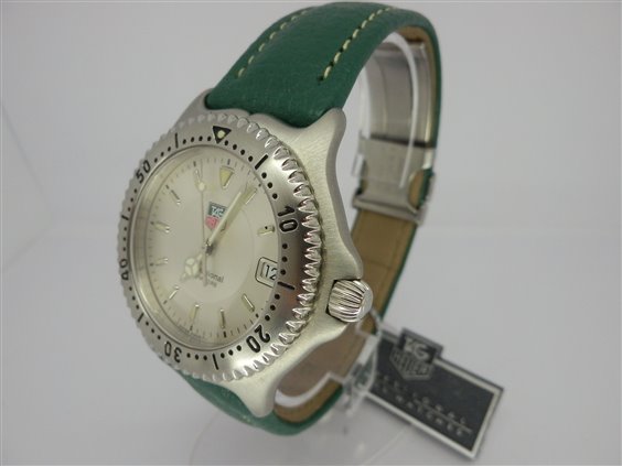 Orologio al quarzo, funzioni ore, minuti, secondi e datario ad ore 3. Serie Sel, la prima serie ad essere progettata esplicitando le "Six Features" di Tag: 1) Resistente all'acqua fino a 200 metri, 2) Corona a vite, 3) Bracciale con doppia chiusura di sicurezza, 4) Lunetta girevole unidirezionale, 5) Vetro zaffiro, 6) Indici luminosi Quadrante colore argento. Cinturino in pelle verde chiusura pieghevole.