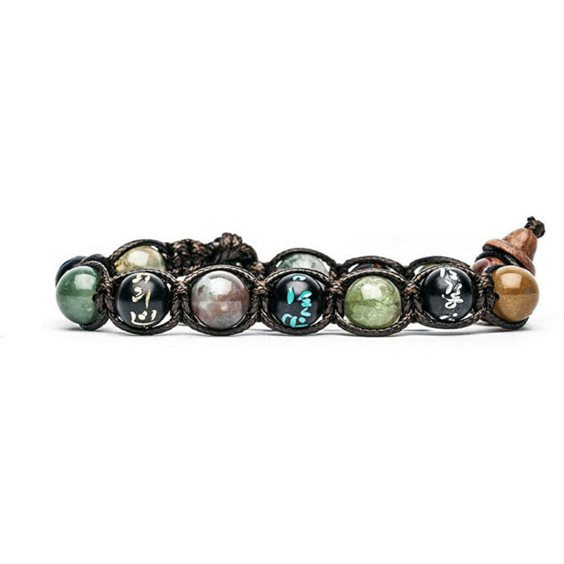 MANTRA AGATA MUSCHIATA Pietra naturale dai colori dal giallo-verde al verde scuro che può essere ricondotta al Buddha Amoghasiddhi, che ambisce al successo, alla ricchezza e al potere. La tonalità variegata potrebbe suggerire un’ambizione meno competitiva e gelosa. Questo Tamashii trasforma l’orgoglio in saggezza d’identità. Bracciale originale tibetano 'Tamashii serie speciale Mantra' realizzato con pietre naturali AGATA MUSCHIATA e legno orientale autentico con SIMBOLI MANTRA incisi a mano. Misura pietre 8mm e taglia unica (il bracciale è predisposto per adattarsi a qualsiasi diametro di polso). Ogni bracciale è spedito con relativa confezione originale e certificato di garanzia. I Mantra sono invocazioni ai Buddha, formule magiche, preghiere o una combinazione di tutte queste. I praticanti tantrici li ripetono al fine di formare una connessione karmica tra loro stessi e le divinita della meditazione, e per effettuare una ristrutturazione cognitiva tramite l'interiorizzazione degli attributi divini rappresentati dal mantra. L'uso dei mantra è centrale nella pratica del Vajrayana, e pertanto questo sistema viene chiamato spesso dai suoi adepti il 'Veicolo del mantra' o 'Veicolo del mantra segreto'. La ripetizione del mantra non è semplicemente un'attivita esterna in cui si vocalizzano suoni; si tratta primariamente di un atto inteso a risvegliare il potenziale cognitivo del meditante. La vocalizzazione esterna dei suoni del mantra serve come punto focale per lo sviluppo mentale. Concentrandosi sul significato dei mantra come spiegato dal guru e aprendosi al loro potere trasformatore, i meditanti risvegliano il proprio potenziale latente di risveglio. La collezione Mantra rappresenta una serie speciale Tamashii. Le pietre sono intercalate con grani in legno autentico orientale (hua-qi-nanmu) inciso e dipinto a mano.