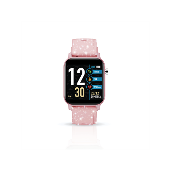 Smartwatch glamour dalle linee eleganti. Ultra leggero e comodo da indossare.Avviso di chiamata, Notifiche, Cardio Tests ( Saturazione del sangue e battito cardiaco), Pedometro, Calorie, Sveglia, Distanza, Sleep Monitor (Controllo della qualità del sonno), Sedentary reminder, Sport, Wrist sense, Music remote control - CINTURINO COL ROSA E GLITTER