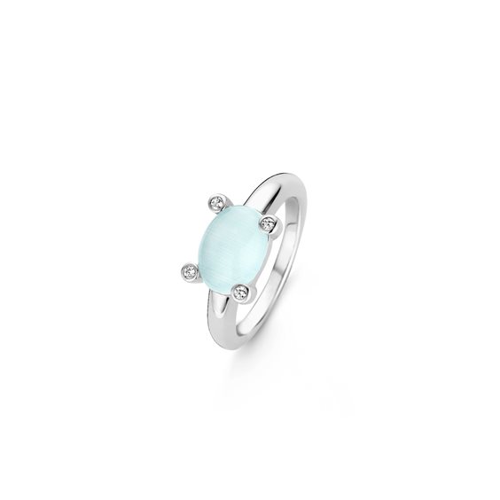Un soffisticato anello TI SENTO - Milano in un colore estivo. Il taglio cabochon e l'ovale cristallo verde acqua sono la parte focale dell'anello. I designer TI SENTO fanno attenzione ad ogni dettaglio questo si riflette nella meravigliosa incastonatura in griffe persino di una piccola zirconia. L'anello è realizzato in argento sterling rodiato. Lo strato di rodio fornisce una lucentezza e protezione di lunga durata al gioiello.