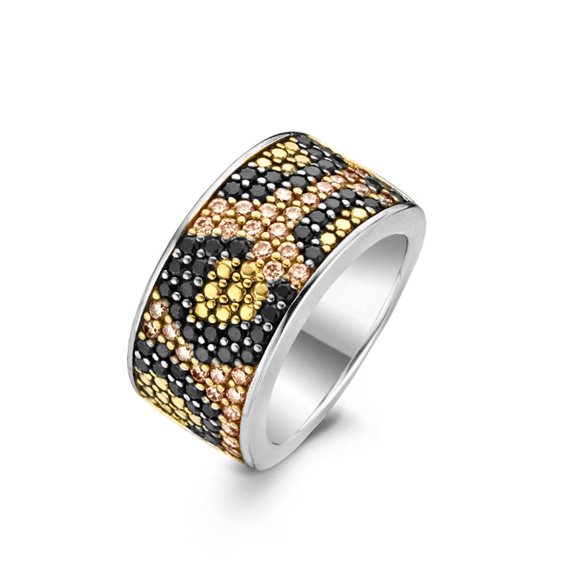 Anello donna Ti Sento Milano In Argento 925/1000 Rodiato e Anallergico con Zirconi Champagne e Spinello.Base in argento con finitura lucida. La parte centrale della fascia è placcata in oro giallo con particolare lavorazione silver dipped con incastonati zirconi di color champagne e spinello nero, il tutto per dare un effetto maculato. Larghezza fascia mm. 11,00 spessore mm. 3,00. Galleria traforata nella parte interna della montatura, ciò per permettere alle pietre di ricevere e sprigionare più lucentezza.