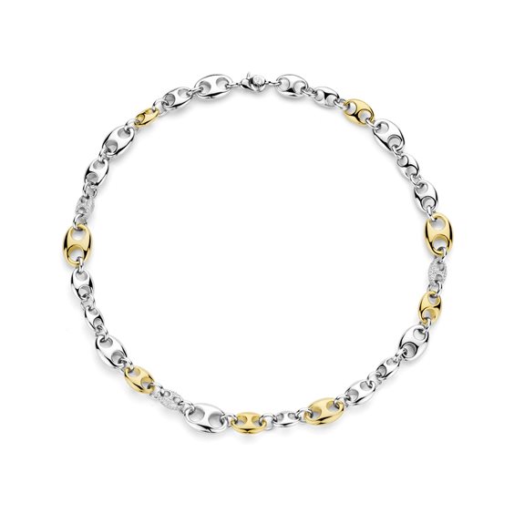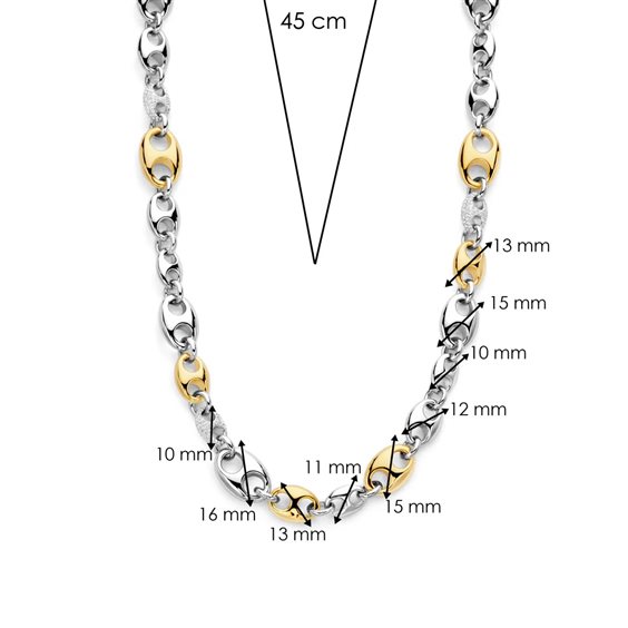 Lasciati conquistare dall'eleganza senza tempo con questa collana TI SENTO in argento placcato oro Coffee Bean 34062ZY/45. Realizzata in argento sterling 925 e placcata in platino per una brillantezza duratura, questa collana presenta un'accattivante sequenza di forme di chicchi di caffè, che si alternano tra argento, placcatura in oro giallo e abbagliante pavé di pietre di zirconia cubica bianca. Questa audace collana è una testimonianza dell'arte della gioielleria raffinata, offrendo un'armoniosa miscela di tradizione e design contemporaneo. Il chicco di caffè, un simbolo intramontabile e iconico, aggiunge un tocco di stravaganza e raffinatezza a qualsiasi outfit. Esalta il tuo look quotidiano con questo splendido pezzo statement. Indossalo da solo per un'audace dichiarazione o sovrapposto ad altre collane TI SENTO per un tocco personalizzato che trasuda sicurezza e fascino. Realizzata con cura per le pelli sensibili, questa collana senza nichel e ipoallergenica assicura comfort e qualità duraturi.