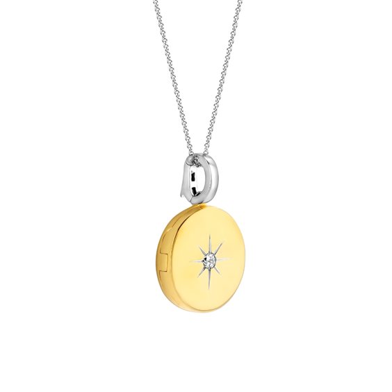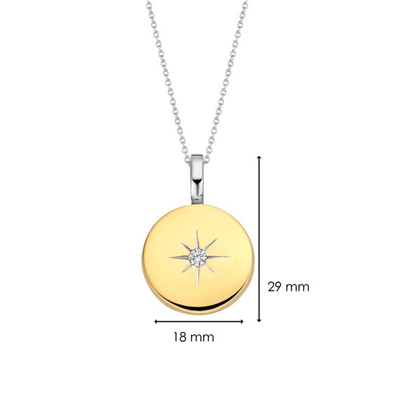Questo pendente d'argento placcato oro TI SENTO - Milano 6790ZY ha uno zircone bianco centrale circondato da una preziosa incisione a stella; come un ciondolo aperto in cui custodire i tuoi sogni. La sua forma perfetta a disco pende delicatamente da una fine catena d'argento. Un gioiello che invita a guardare le stelle tenendo i piedi per terra.