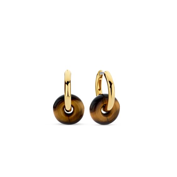 Questi orecchini d'argento placcato oro TI SENTO - Milano spiccano per le due grandi di pietre di occhio di tigre che pendono delicatamente dai cerchi placcati oro. L'originale forma a ciambellina della pietra fa di questi orecchini, realizzati in argento sterling 925‰, una piccola opera d'arte. I toni caldi di questi gioielli emanano equilibrio e grande energia. Abbinali ad altri orecchini per un look di grande personalità.