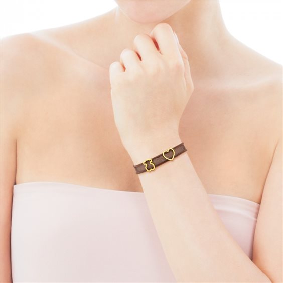 bracciale in argento placcato oro brown, maglia mesh larghezza 10mm, chiusura a moschettone, elementi inseriti orsetto icona