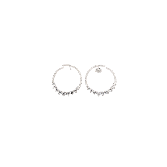 Orecchini a cerchio in argento 925% ideati e realizzati da Trova Gioielli, gli orecchini sono impreziositi da zirconi bianchi, diametro 2,5 centimetri, chiusura a farfallina.