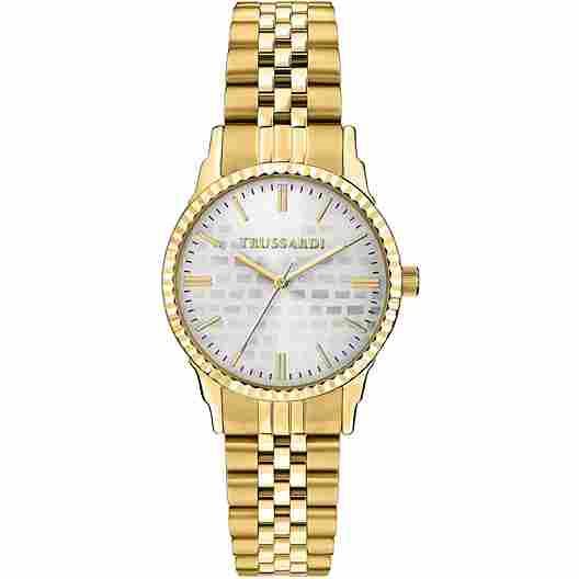Prodotto: orologio solo tempo donna Trussardi T-Bent R2453144509 orologio di Trussardi da donna della collezione T-bent. L'orologio è oro e e ha forma rotonda. L'orologio è in acciaio. Dimensione cassa: 32mm. L'orologio ha vetro minerale e resistenza all'acqua: 5 ATM. Funzioni: solo tempo, 3H. La referenza è: R2453144509 Questo articolo verrà spedito con Scatola Originale Trussardi se prevista dal brand