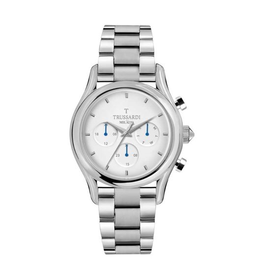 Orologio Trussardi multifunzione da uomo con movimento al quarzo. La cassa rotonda realizzata in acciaio inox ha diametro di 43 mm con quadrante analogico bianco brillante; indici a bastoni silver, tre lancette, logo trussardi nella parte alta del quadrante e datario con giorno del mese e della settimana. Fondello in acciaio e vetro di tipo minerale. Cinturino in acciaio inossidabile e anallergico e chiusura deployante con pulsanti. Appartiene alla collezione T-Light.