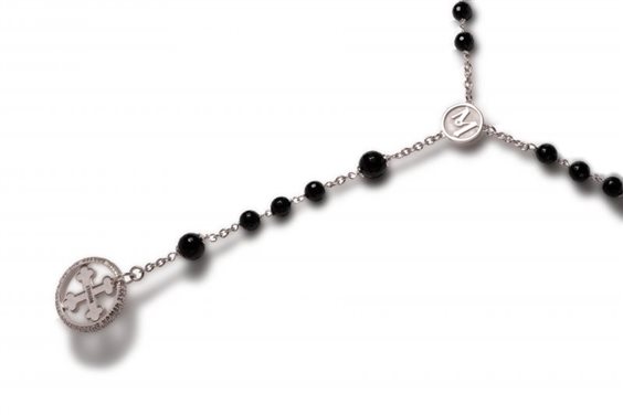 ROSARIO MAGNUM IN ARGENTO RODIATO CON ONICE Collana rosario argento e pietre preziose Il Rosario di Tuum è un omaggio alla bellezza simbolica ed estetica dell’originale “Rosarium” che in Latino indicava letteralmente una “Corona di Rose”. Nella parte finale risplende “flore” custodito in un cerchio con impressa in rilievo la preghiera del Padre Nostro in Latino.