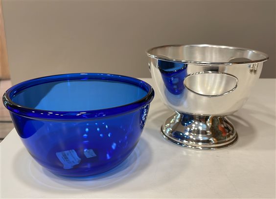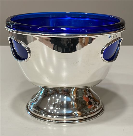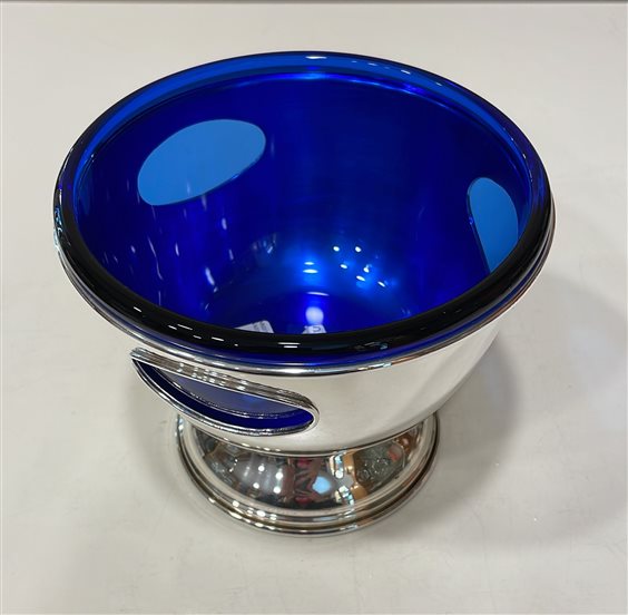 PREGIATO PEZZO D'ARGENTERIA. L'ALTA QUALITA' DEI MATERIALI E DELLA LAVORAZIONE SONO GARANTITI DAI MARCHI LEGALI IMPRESSI SUL PEZZO. ALZATA PICCOLA IN ARGENTO MASSICCIO OTTOCENTO, GR 230, CON ALL'INTERNO CIOTOLA IN CRISTALLO BLU, SUPERFICIE E BORDI LISCI, INCISIONI OVALI SUI LATI.