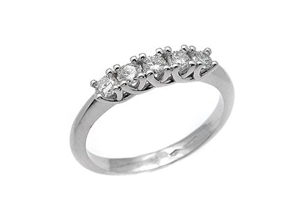 Anello modello riviera in oro bianco 18Kt, gr 2,6, rodiato. Cinque diamanti taglio brillante, colore G, purezza VS. Carati totali 0,33, incassati a griffe. Misura 14.