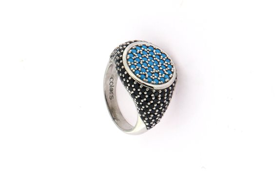 ANELLO IN ARGENTO 925% CON AGATE NERE E AZZURRE MODELLO CHEVALIER. MANIFATTURA ARTIGIANALE