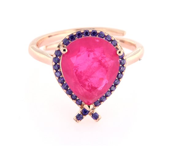 anello in argento placcato oro rosa con agata color rosa fuxia . taglio briolè circondata da zirconi neri. misura regolabile