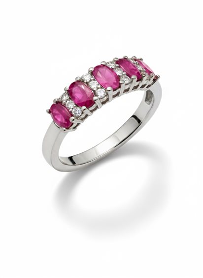 Un raffinato equilibrio di luce e colore. Questa fedina in oro bianco 18 carati è impreziosita da zirconi rossi dal taglio ovale, alternati a zirconi bianchi brillanti, creando un gioco di contrasti luminosi e vibranti. Perfetta come anello da cerimonia, anniversario o regalo importante, si distingue per l’eleganza intramontabile e la lavorazione artigianale di alta qualità.