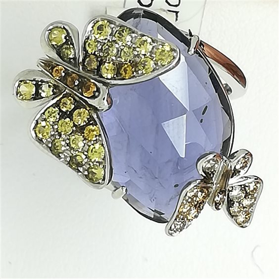 Anello fantasia inoro bianco con iolite, zaffiri e diamanti colorati
