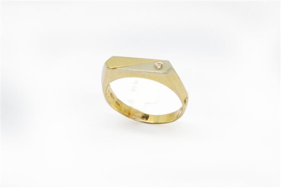 Anello classico da uomo con parte sopra a forma rettangolare divisa da oro giallo e oro bianco con incastonato brlillantino kt 0,02. La parte superiore dell'anello misura 17 x 4 mm .Il gambo nella parte inferiore più sottile misura 4mm. Elegante anello da uomo, leggero e di facile indosso, perfetto come idea regalo per lui, realizzato in Italia.