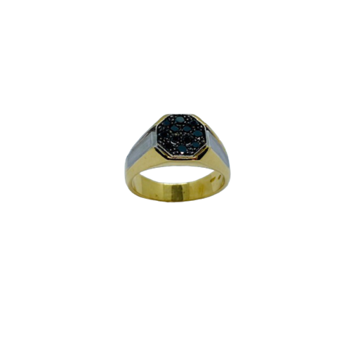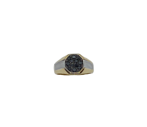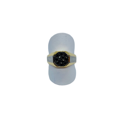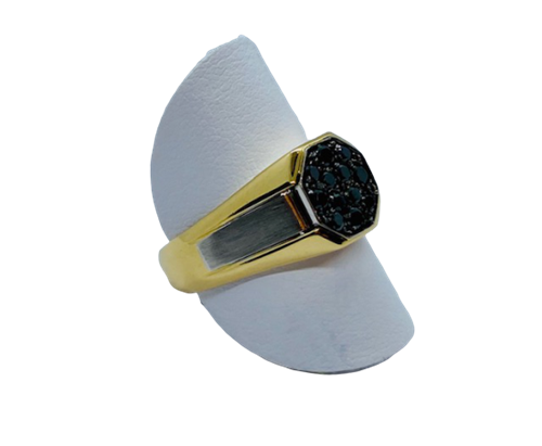 ANELLO IN ORO GIALLO E BIANCO 18 K CON DIAMANTI TAGLIO BRILLANTE DI COLORE NERO. ANELLO CON FINITURA LUCIDA SU ORO GIALLO E FINITURA SATINATA SU ORO BIANCO CON PAVE' DI DIAMANTI NERI SULLO SCUDO .