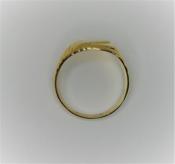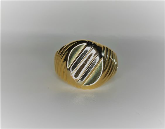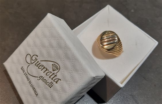 Anello chevalier in oro giallo, bianco e rosa 18Kt, gr 11,2. Misura 21. Possibilità di piccola incisione all'interno del gambo. IN CASO DI INCISIONE NON SARA' POSSIBILE IL RESO.