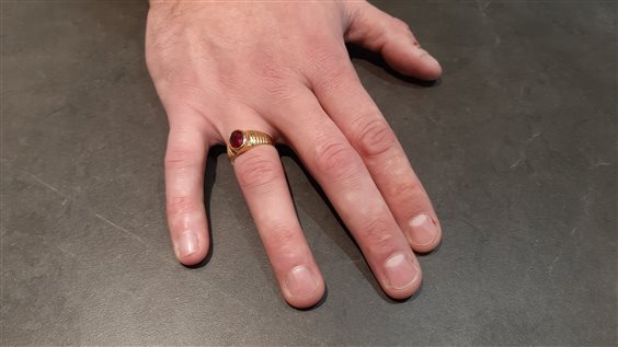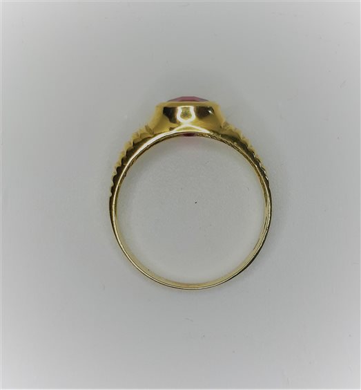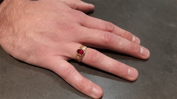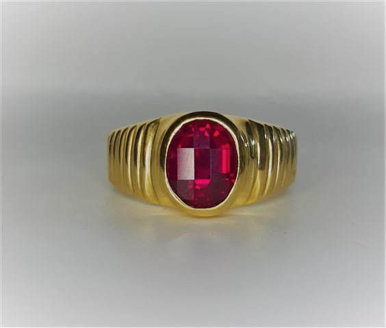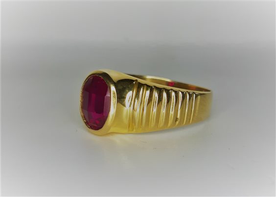 Anello in oro giallo 18Kt, gr 6,1. Pietra dura rossa sfacettata incassata con bordo. Misura 28. Possibilità di piccola incisione all'interno del gambo. IN CASO DI INCISIONE NON SARA' POSSIBILE IL RESO.