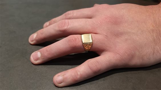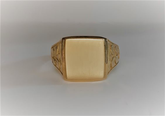 Anello chevalier in oro giallo 18Kt, gr 5,6. Piastra satinata con possibilità di piccola incisione. Misura 25. IN CASO DI INCISIONE NON SARA' POSSIBILE IL RESO.