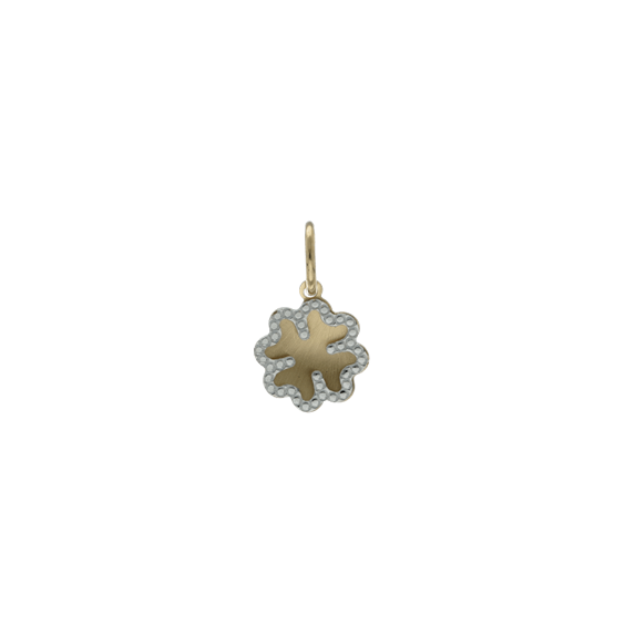 Ciondolo a quadrifoglio in oro bianco e giallo 18 carati ideato e realizzato dai maestri orafi italiani, il ciondolo ha un peso di 0,5 grammi, lunghezza 1,2 centimetri compreso l'occhiello.