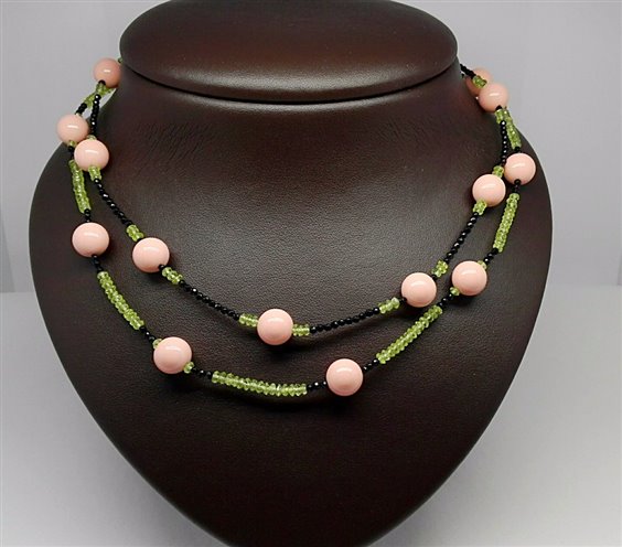 Collana a due fili pietre dure multicolore peridotto onice e corallo ricostruito.
