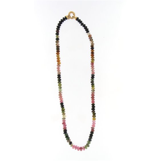 collana in pietre dure tormalina tagliate a forma ellittica di colore che va dal verde scuro ,all'ambra ,al rosa ,al verde chiaro . chiusura con molla aprente in oro 18 kt. certificato di garanzia