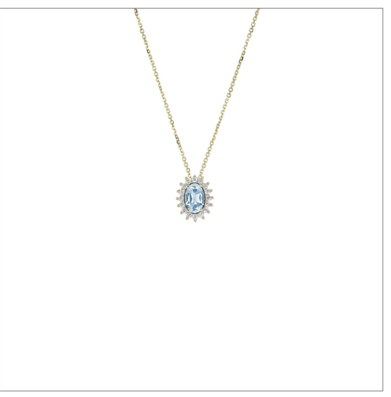 Collana in oro giallo 375% con pendente ovale zircone azzurro e giro di zirconi a griffe