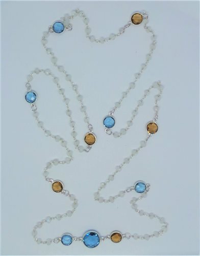 Collana lunga in argento 925 rodiato e pietre dure. Cristallo di rocca sfaccettato, quarzo idrotermale sfaccettato azzurro e fumè. Misura cm 100.