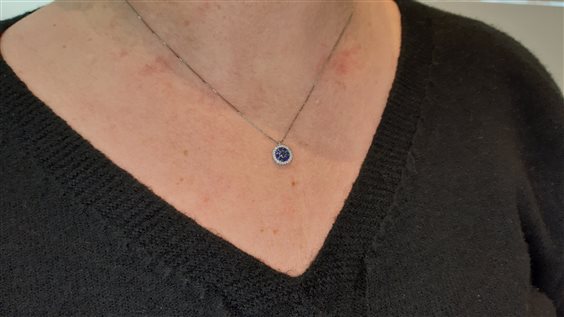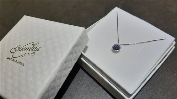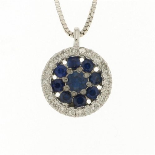 Girocollo in oro bianco rodiato 18Kt, gr 2. Catena maglia veneziana. 9 zaffiri taglio brillante, carati totali 0,28. Diamanti taglio brillante, colore H, purezza VS, carati totali 0,12. Diametro pendente cm 1. Misura cm 45. MADE IN ITALY