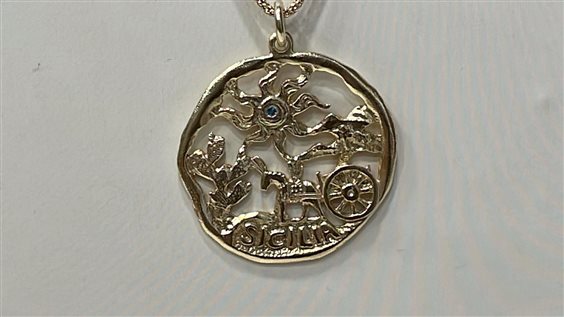 COLLANA TERRE DI SICILIA IN ARGENTO PLACCATO ORO GIALLO CON PENDENTE A CERCHIO CON RAFFIGUARATO UN CARRETTO SICILIANO CON CAVALLO, SOLE, SCRITTA SICILIA E ALBERO DI FICO D'INDIA, ZIRCONI BLU.