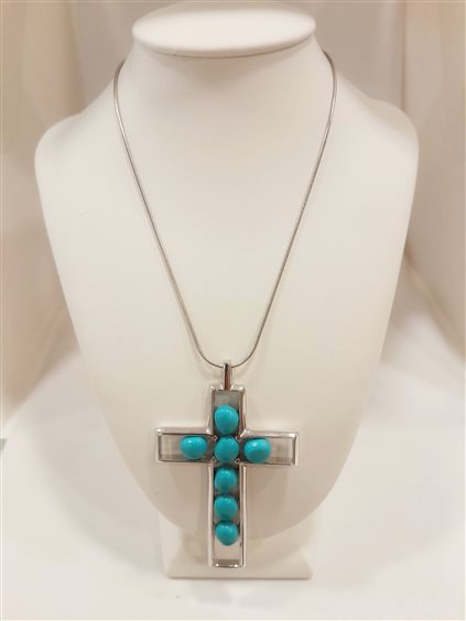 Girocollo in argento 925, pendente croce con pepite in pasta di turchese. Catena maglia coda di topo, chiusura con moschettone
