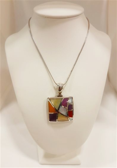 Girocollo mosaico in argento 925 con pendente quadrato con mosaico multicolor di pietre dure e madreperla. Catena semirigida maglia coda di topo, chiusura con moschettone