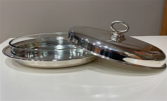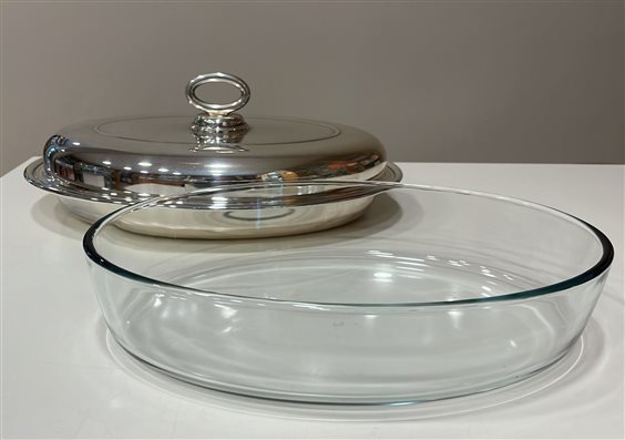 PREGIATO PEZZO D'ARGENTERIA. L'ALTA QUALITA' DEI MATERIALI E DELLA LAVORAZIONE SONO GARANTITI DAI MARCHI LEGALI IMPRESSI SUL PEZZO. PIROFILA IN ARGENTO MASSICCIO 800, GR 1080, CON COPERCHIO E ALL'INTERNO UN TEGAME DA FORNO DALLA MISURA DI 30X21CM IN VETRO TEMPERATO PIREX.