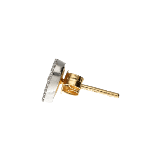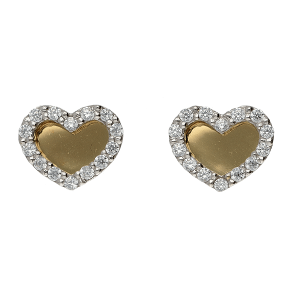 Orecchini a cuore in oro bianco e giallo 18 carati ideati e realizzati da maestri orafi italiani, peso 1,2 grammi, diametro 0,5 centimetri, chiusura a farfallina.