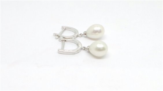 orecchino in oro bianco con chiusura a scattino con perno per lobo forato e perla di acqua dolce a forma di goccia pendente lunghezza tot cm 2 . diametro perla mm 7,5 . certificato di garanzia