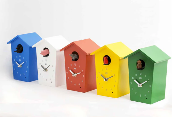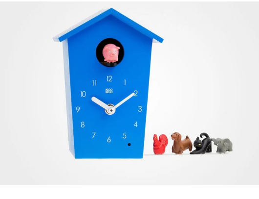 Animal House Piccolo cucù in legno MDF con suoni di animali Meccanismo al quarzo, sensore della luce e controllo del volume Batterie AA 3 non incluse Meccanismo a cucù con 5 animali in metallo e 5 diverse suonerie corrispondenti al verso dell'animale sostituibili con attacco magnetico: uccellino, gatto, cane, elefanti, maialino