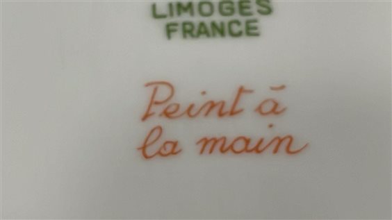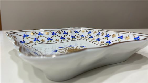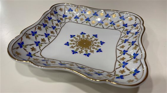 PIATTO QUADRANGOLARE IN PORCELLANA LIMOGES FRANCE DECORATO A MANO, MOTIVI FLOREALI MULTICOLOR E BORDO ONDULATO IN ORO.