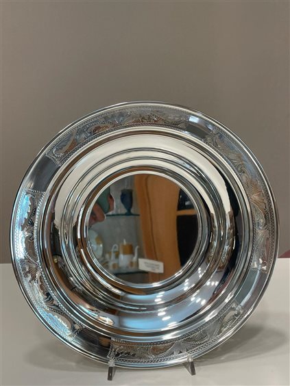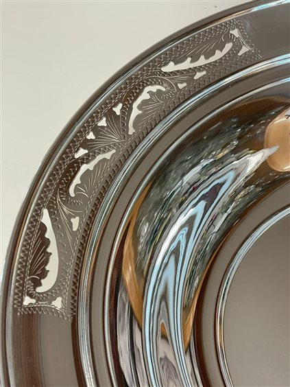 PREGIATO PEZZO D'ARGENTERIA DELL'ARTIGIANATO FIORENTINO. L'ALTA QUALITA' DEI MATERIALI E DELLA LAVORAZIONE SONO GARANTITI DAI MARCHI LEGALI IMPRESSI SUL PEZZO. PIATTO TONDO IN ARGENTO MASSICCIO 800 CON BORDO TRAFORATO CON MOTIVI ASIMMETRICI. BASE LISCIA.