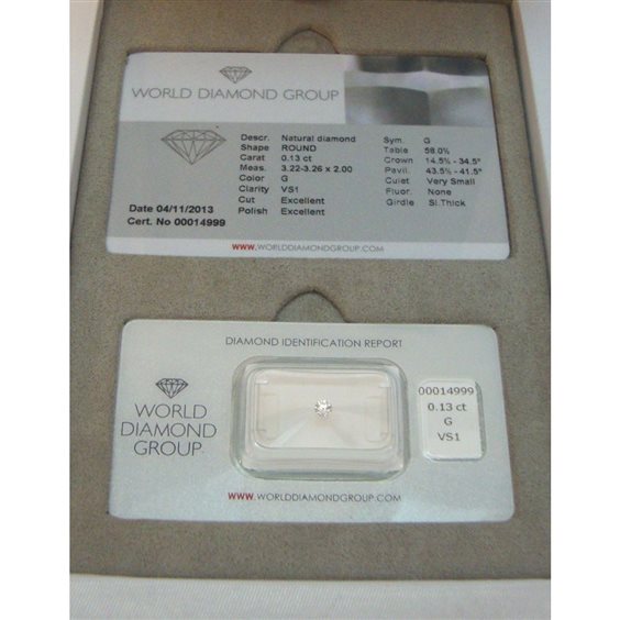 Diamante naturale in blister di carati 0,13, colore G, purezza VS1, forma ROUND, taglio EXCELLENT, pulitura EXCELLENT, misura 3,22 x 3,26 x 2 millimetri, fluorescenza NONE, garantito da WORLD DIAMOND GROUP.