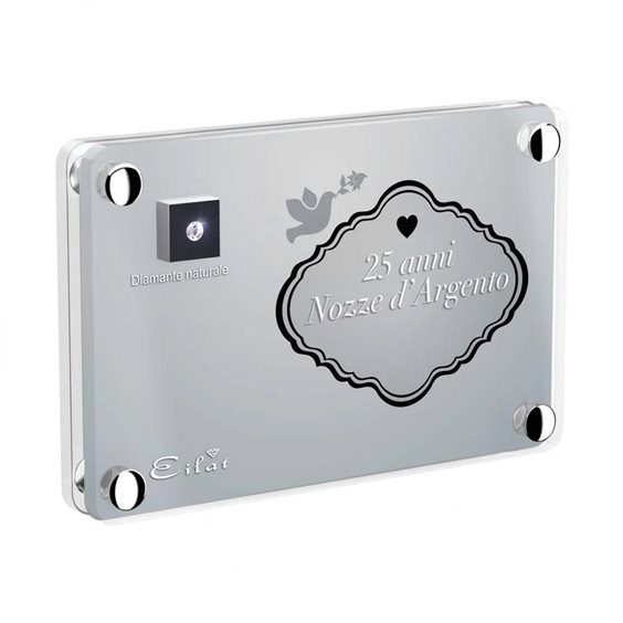 DIAMANTE IN BLISTER PERSONALIZZABILE. Puoi scegliere di personalizzare il tuo regalo scegliendo tra tante immagini e dediche diverse! CARATTERISTICHE Pietra: Diamante “Bianco” Peso: 0,05ct Purezza: G-VS Confezione: Confezione Light Misure: 8,5 cm x 5,5 cm DIAMANTE “BIANCO” Questo blister non solo protegge il diamante ma amplifica e valorizza l’effetto visivo della pietra. Un elegantissimo cofanetto, come tocco finale, esalta tutto lo splendore del diamante nel blister, riflettendo con intensità la qualità e valore del prodotto Eilat Diamonds. CONFEZIONE LED La Confezione Led è dotata di due speciali faretti che esaltano la brillantezza del diamante Eilat Diamonds e i colori della card personalizzata, rendendo speciale il tuo dono, per un effetto unico e sorprendente. Raffinata e originale la Confezione Led custodisce mirabilmente il tuo Regalo Unico.