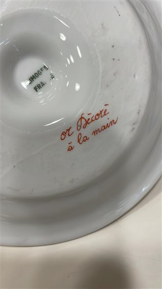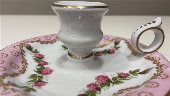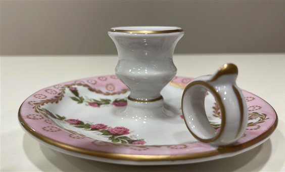 PORTACANDELE A UNA FIAMMA MAZZANTI LIMOGES FRANCE DECORATO A MANO CON MOTIVI FLOREALI ROSE FUCSIA E DECORI IN ORO, BORDO ORO. DECORATO A MANO.