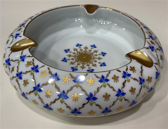 POSACENERE ROTONDO IN PORCELLANA LIMOGES FRANCE DECORATO A MANO, MOTIVI FLOREALI MULTICOLOR E BORDO IN ORO.