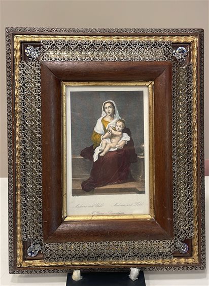 QUADRO CON CORNICE IN LEGNO CON APPLICAZIONI LEGA ARGENTATA ANTICHIZZATA CON MURRINE AUTENTICHE, OPERA SIVIGLIA 1617/1682, AUTORE CATALANO MADONNA CON BAMBINO, LA STAMPA E' INTERAMENTE ESEGUITA A TORCHIO E LAVORATA A MANO.