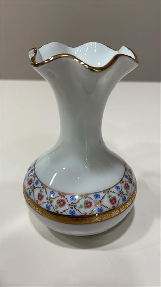VASETTO IN PORCELLANA BIANCA LIMOGES FRANCE CON DECORI ORO FATTI A MANO, MOTIVI FLOREALI MULTICOLOR E BORDO ORO A ONDE.