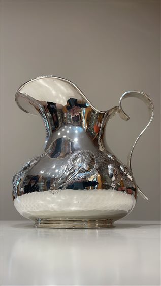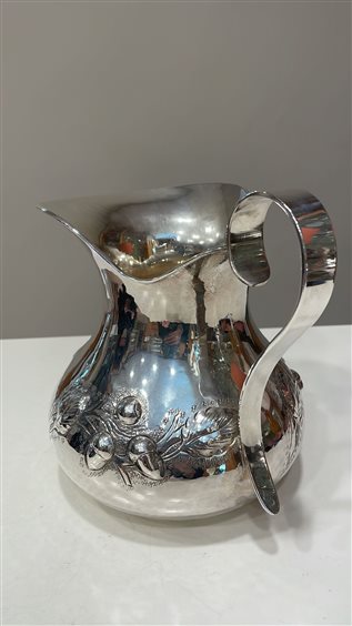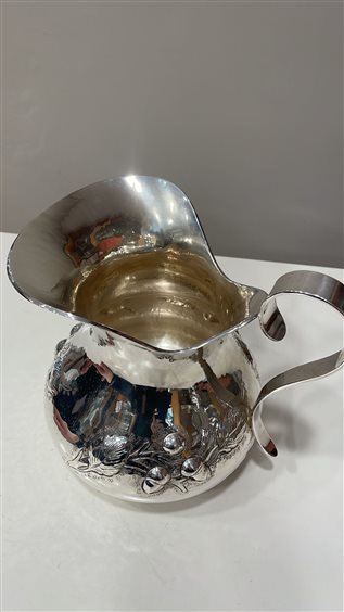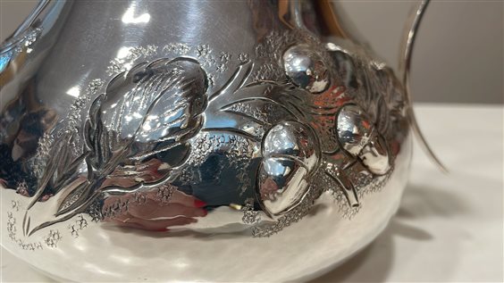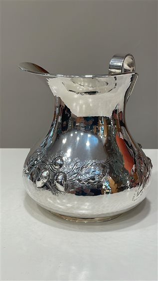 PREGIATO PEZZO D'ARGENTERIA DELL'ARTIGIANATO. L'ALTA QUALITA' DEI MATERIALI E DELLA LAVORAZIONE SONO GARANTITI DAI MARCHI LEGALI IMPRESSI SUL PEZZO. BROCCA CONTINO IN ARGENTO, GR 657. BROCCA CON INCISIONI FATTE A MANO GHIANDE E MOTIVI FOGLIACEI