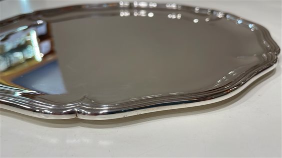 PREGIATO PEZZO D'ARGENTERIA. L'ALTA QUALITA' DEI MATERIALI E DELLA LAVORAZIONE SONO GARANTITI DAI MARCHI LEGALI IMPRESSI SUL PEZZO. VASSOIO SMERLATO ARGENTO MASSICCIO 800 BASE LISCIA